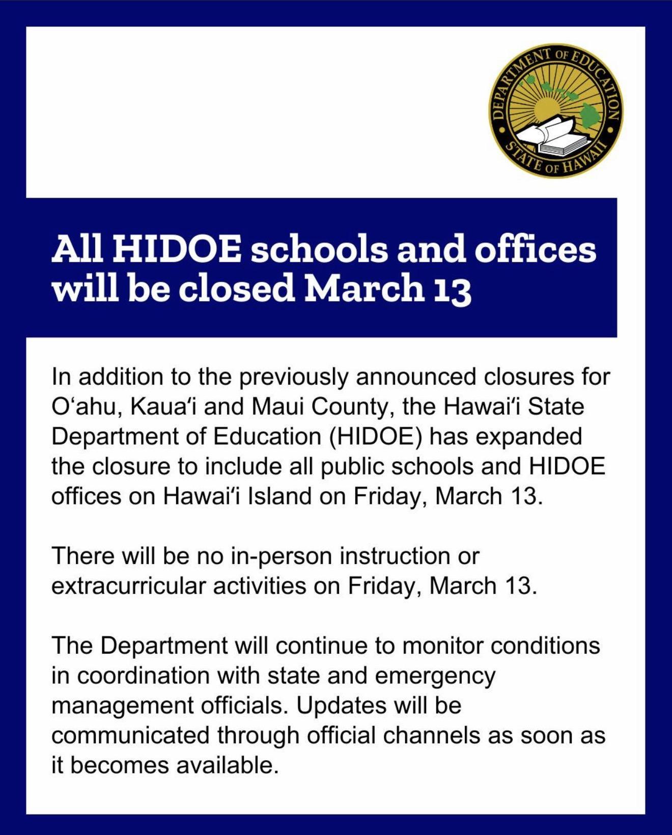 In alignment with Gov. Josh Green’s directive and guidance from the Hawaiʻi State Department of Education, all Hawai`i County public schools including Haʻaheo Elementary will be closed on Friday, March 13, due to current severe weather conditions.